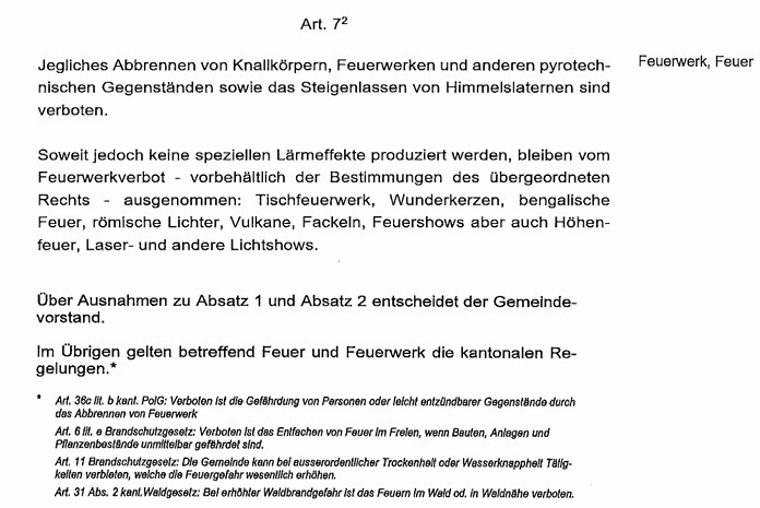 Für die Anlässe des Bundesfeiertags (1. August) sowie Silvester/Neujahr wird vom Vorstand gewöhnlich, unter Beachtung der konkreten Lage, eine generelle Ausnahme für die Feuerwerksarten gemäss Art. 7 Abs. 2 PolG verfügt. Beim ausnahmsweise erlaubten Abbrennen von Feuerwerk ist grosse Vorsicht walten zu lassen.