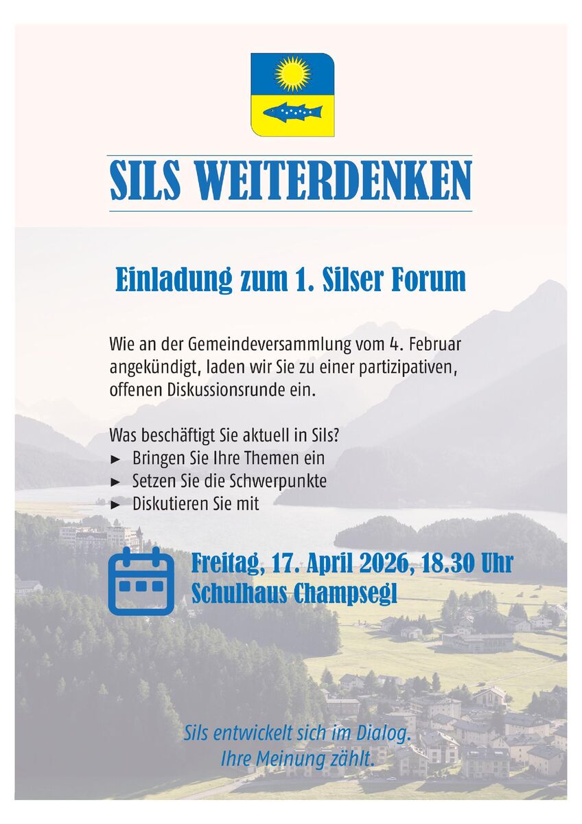 Die Gemeinde Sils lädt zum ersten Silser Forum ein. Die Veranstaltung bietet eine Plattform für Information, Austausch und Diskussion zu aktuellen Themen der Gemeinde.