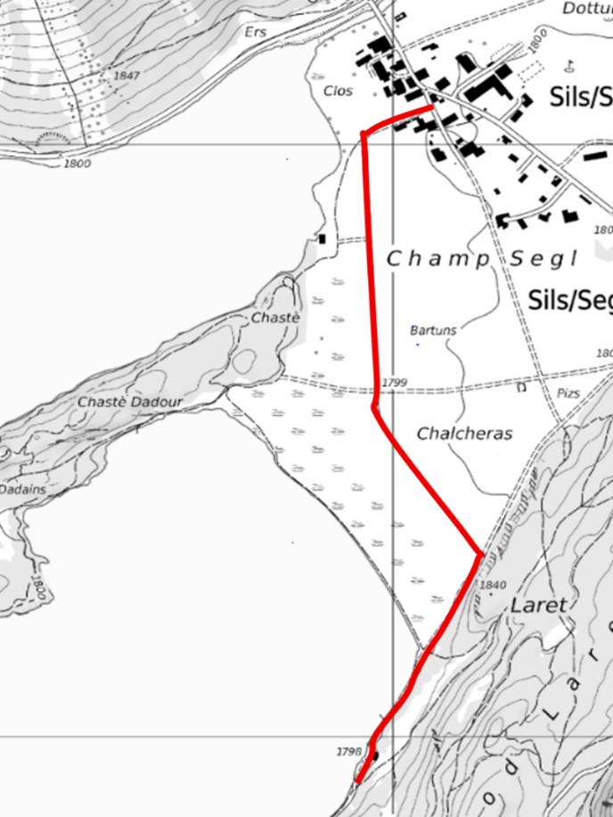 Für den Zugang zum Stollen und die Installationsarbeiten wird eine temporäre Baupiste durch die Silserebene eingerichtet. Die alternative Route via Alpenrose verläuft durch die Schutzzone des Silser Trinkwassers und konnte vom Kanton nicht bewilligt werden. Die Arbeiten werden so geplant, dass die Umgebung möglichst wenig beeinträchtigt wird. Nach Abschluss der Arbeiten wird die Baupiste im Frühling 2027 wieder zurückgebaut.