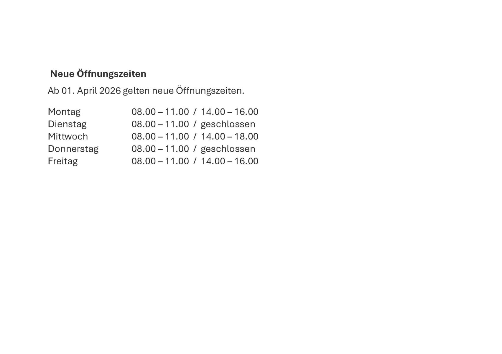 Neue Öffnungszeiten der Gemeindekanzlei ab 01. April 2026